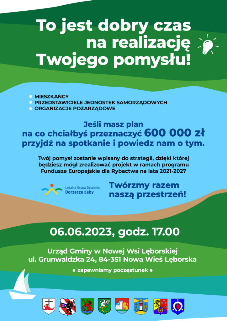 Lokalna Grupa Działania „Dorzecze Łeby” zaprasza na spotkanie dotyczące przygotowania Lokalnej Strategii Rozwoju, które odbędzie się o godzinie 17.00 w dniu 06.06.2023 roku w Urzędzie Gminy w Nowej Wsi Lęborskiej. Będzie to kolejne z 10 zaplanowanych spotkań, które mają na celu uwzględnienie potrzeb samorządów, przedsiębiorców, organizacji pozarządowych oraz mieszkańców przy tworzeniu budżetu w ramach „Funduszy Europejskich dla Rybactwa” w nowej perspektywie finansowej na lata 2021-2027.