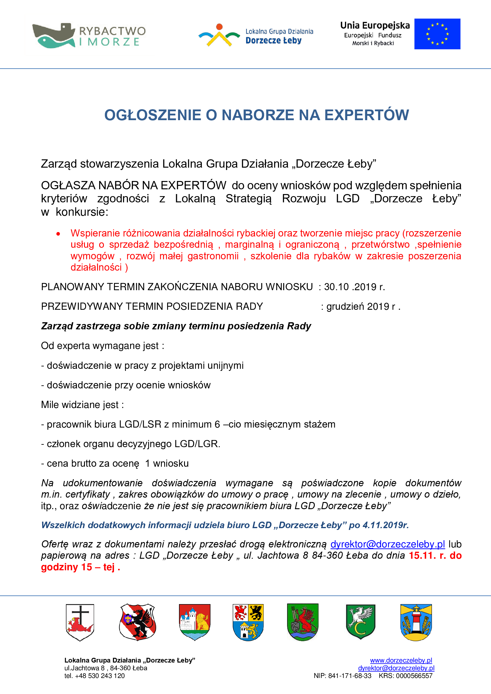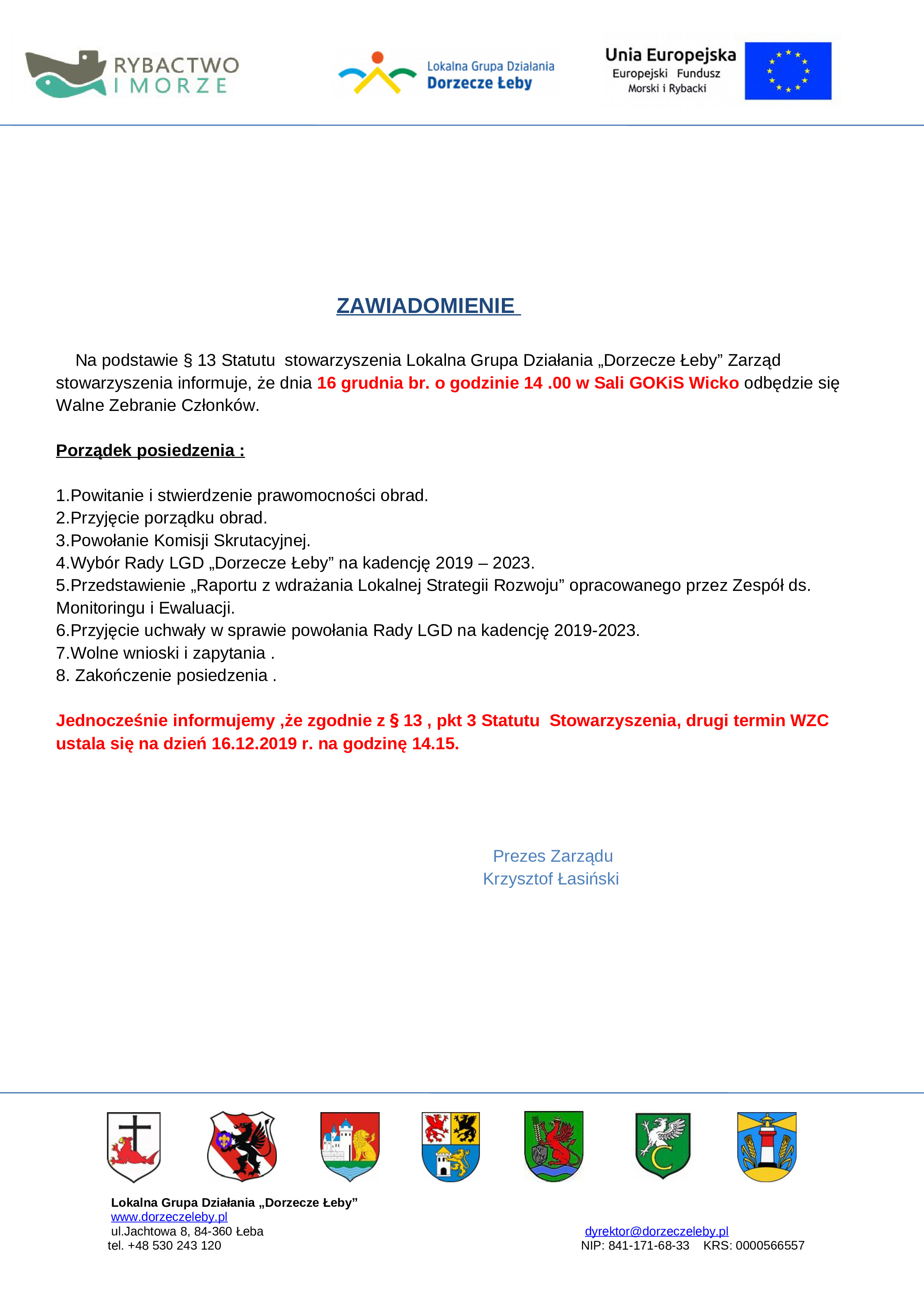 - Rada Stowarzyszenia Lokalna Grupa Działania „Dorzecze Łeby”- skład obowiązujący od dnia 16.12.2019 r.