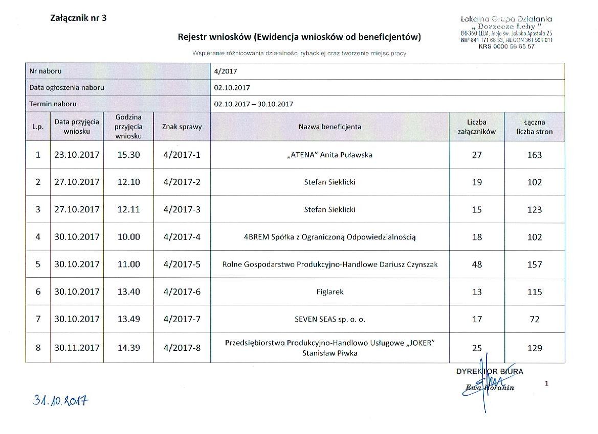 Lokalna Grupa Działania "Dorzecze Łeby" publikuje rejestr wniosków złożonych w ramach naboru, który zakończył się 30.10.2017 roku: