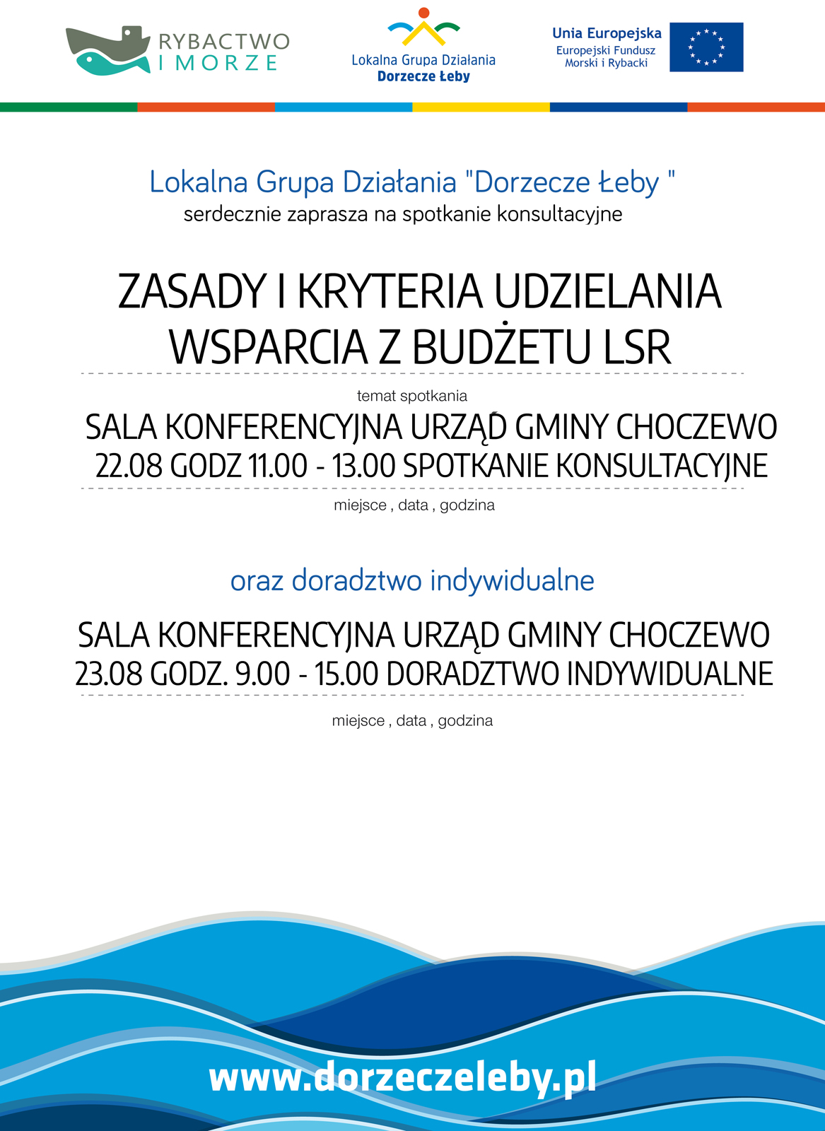 W dniu 22.08.2019 roku odbyło się spotkanie konsultacyjno-informacyjne dotyczące konkursów 1/2019 i 2/2019 ogłaszanych przez LGD "Dorzecze Łeby" w 2019 roku. Natomiast w dniu 23.08.2019 roku miało miejsce doradztwo indywidualne, na którym omawiano konkretne pomysły i projekty.